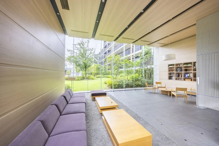 ラウンジの大きな窓からは「四季のコミュニティ広場」が季節の「景」を演出します。春にはソメイヨシノの美しい風景を望み、用意されたソファとテーブルで、ふっと憩える空間に仕立てられています。